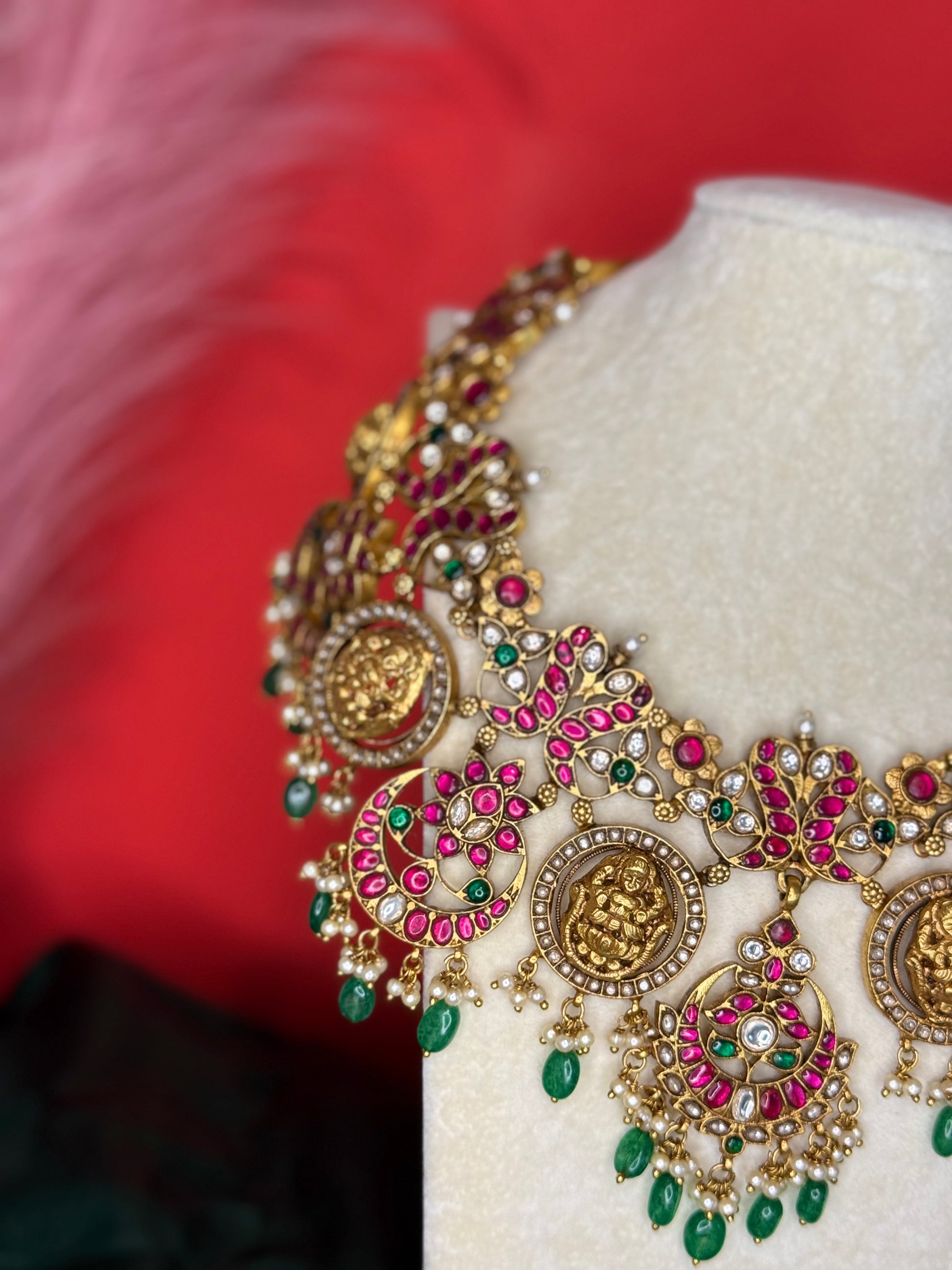 Crafted in premium brass with intricate Lakshmi motifs, dazzling ruby & green kundan work, and delicate pearl drops 🌸